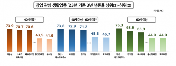 신규 사업자가 많은 상위 20개 업종 중에서는 3년 생존율이 높은 업종은 미용실 73.4%로 가장 높았고, 2위가 펜션, 게스트하우스로 73.1%, 3위가 교육학원으로 70.1% 순이다. 이들 업종은 창업 3년 후까지 생존율이 70% 이상이라 가장 안정적인 업종 축에 속한다.